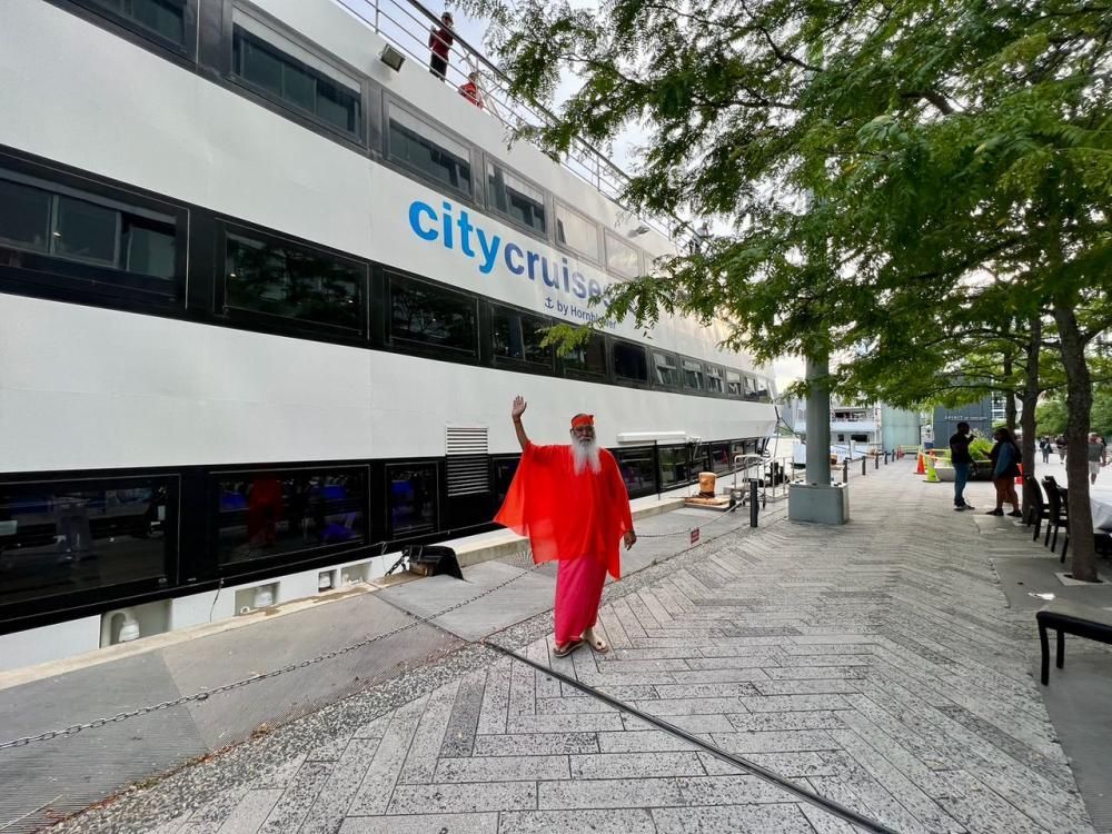 Pujya Swamiji arrived at the Navy pier in downtown Chicago where the boat was anchored at 6 PM. The boat was filled with devotees numbering about 400. Sri.KK Malani and Pastor Kudos Badmos offered garland to Pujya Swamiji.