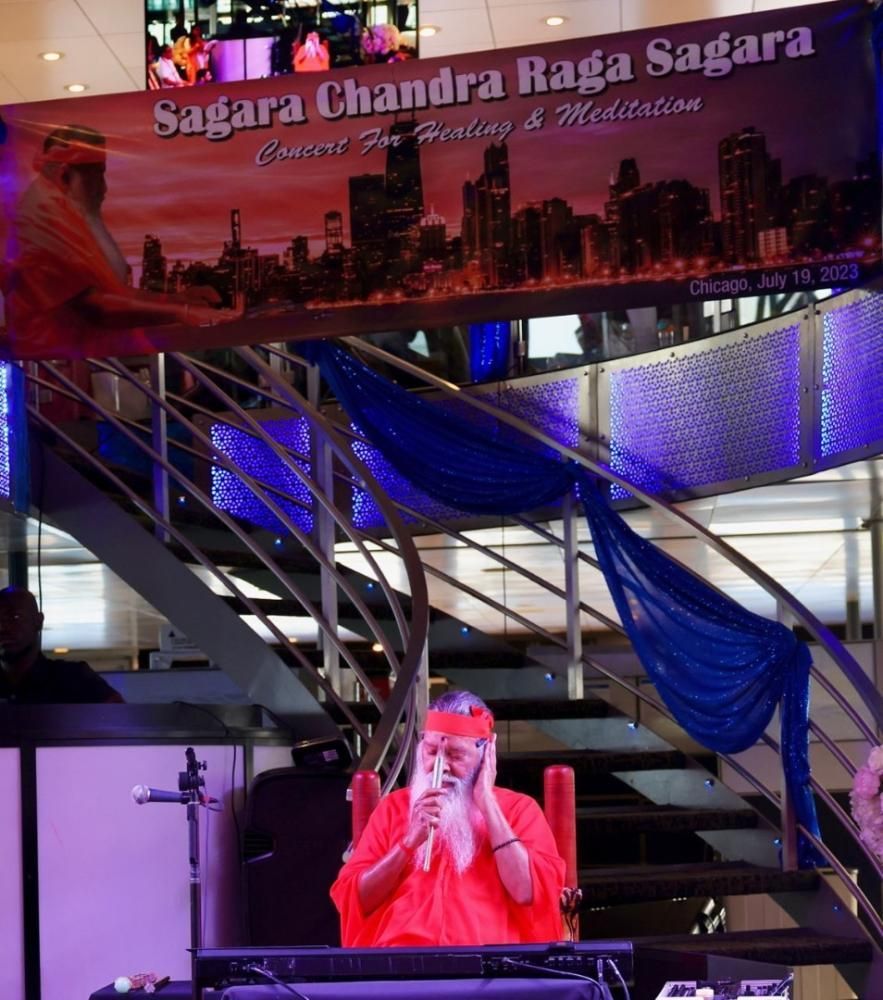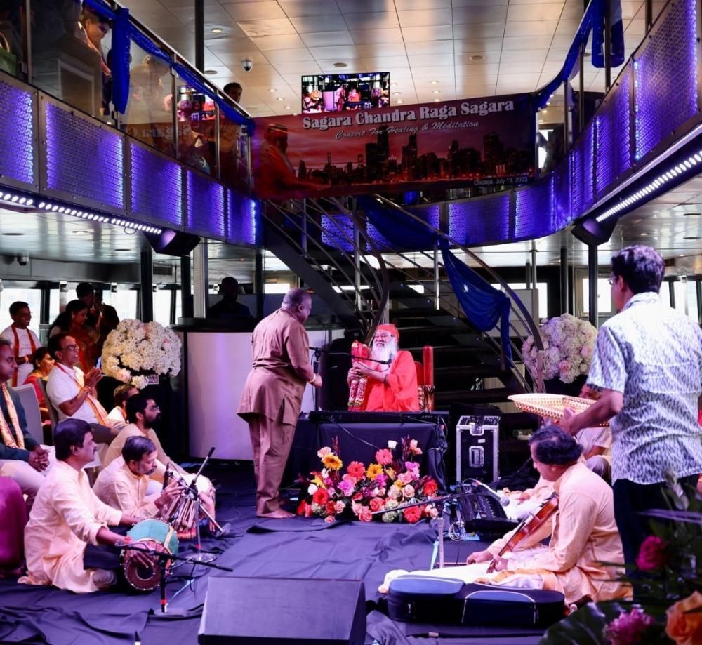 On July 19, 2023, Wednesday, Pujya Swamiji’s music for meditation concert titled “Sagara Chandra Raga Sagara” took place in Lake Michigan aboard “Spirit of Chicago” - a large 400 person boat.