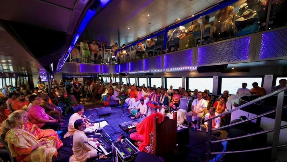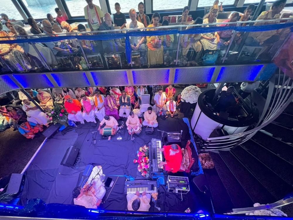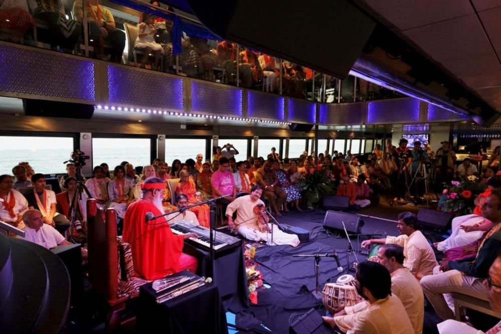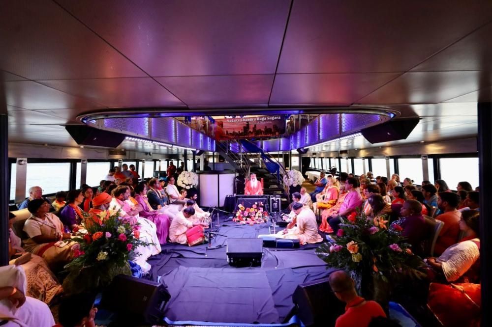 Devotees were spread across three floors of the large boat. About 150 devotees were on the same floor of Sri Swamiji’s music. This was the first time ever that Pujya Swamiji’s concert was taking place on a moving boat. Sri Swamiji played the three Ragas - Brindavani, Vijayanaagari & Sarasangi as the “Sagara Chandra Raga Sagara” meditation music. The new Raga - Vijaya Naagari” was being played for the first time in a concert.