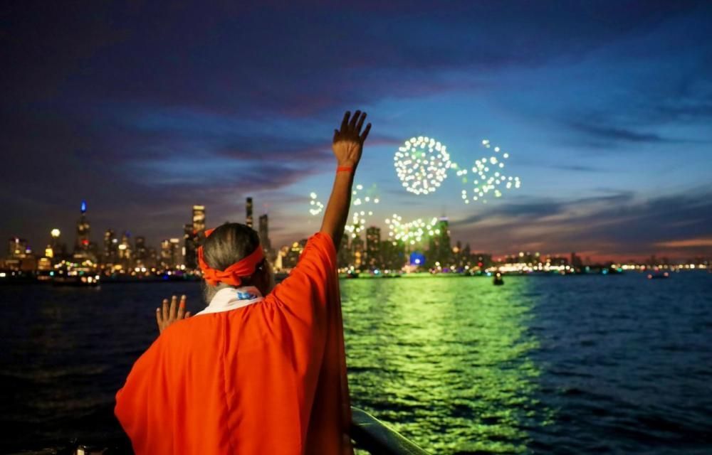After the concert, Sri Swamiji and devotees watched the fireworks on Chicago city line and the crescent moon added to the visual delight. Devotees sang “Nava Chalpadi” Bhajan as the boat returned to the dock.