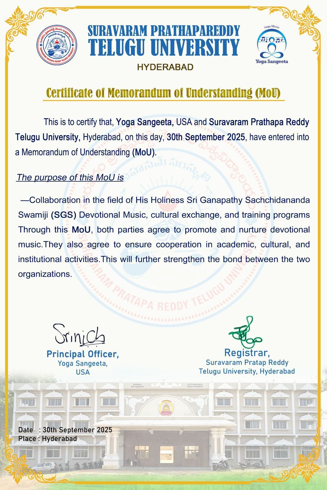 Sri Swamiji has elevated Carnatic music into a medium of spiritual and therapeutic transformation through his unique approach to Nada Chikitsa (sound healing). He has composed over 3,000+ devotional bhajans in multiple languages, enriching the spiritual and musical landscape with accessible, soul-stirring compositions. Sri Swamiji hails from the revered lineage of Venkatamakhi, the architect of the 72 Melakarta rāga system, anchoring his musical vision in classical authenticity. On July 9, 2025, he led the world’s largest Carnatic band, comprising 955 participants, and set a Guinness World Record, uniting global communities through music. Through healing concerts and the Nada Yoga Research Center in Mysuru, Sri Swamiji has championed the integration of music, wellness, and spirituality. He has felicitated numerous stalwarts of Carnatic music, including Semmangudi Srinivasa Iyer, M.S. Subbulakshmi, and Lalgudi Jayaraman, recognizing their timeless contributions. Many eminent musicians have described a profound spiritual experience while rendering Sri Swamiji’s compositions, often attributing it to the Beeja Mantras and healing vibrations embedded in his music.